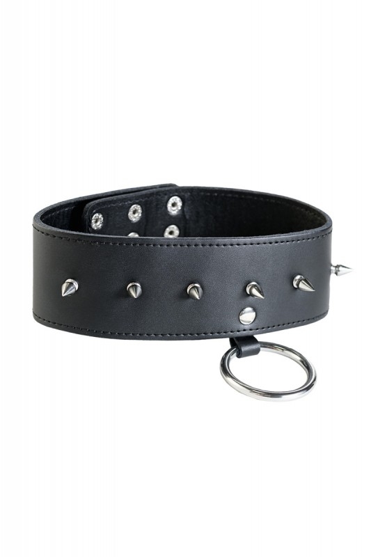 Выполнен из натуральной кожи в черном цвете и декорирован рядом металлических острых шипов. Большое кольцо на ошейнике позволяет крепить различные девайсы, либо поводок!