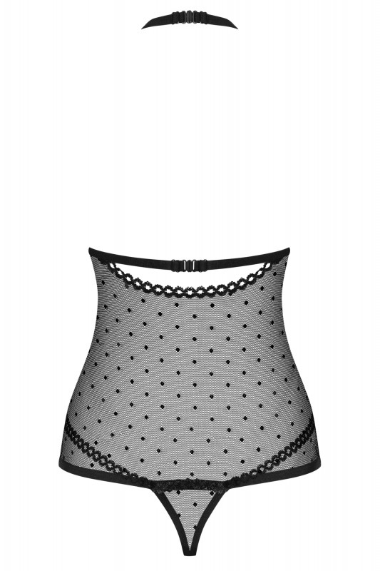 Глубокое декольте с кристаллом на ложбинке акцентирует внимание на бюсте, а низ боди в виде трусиков стринг с двойным пояском привлекает внимание к ягодицам