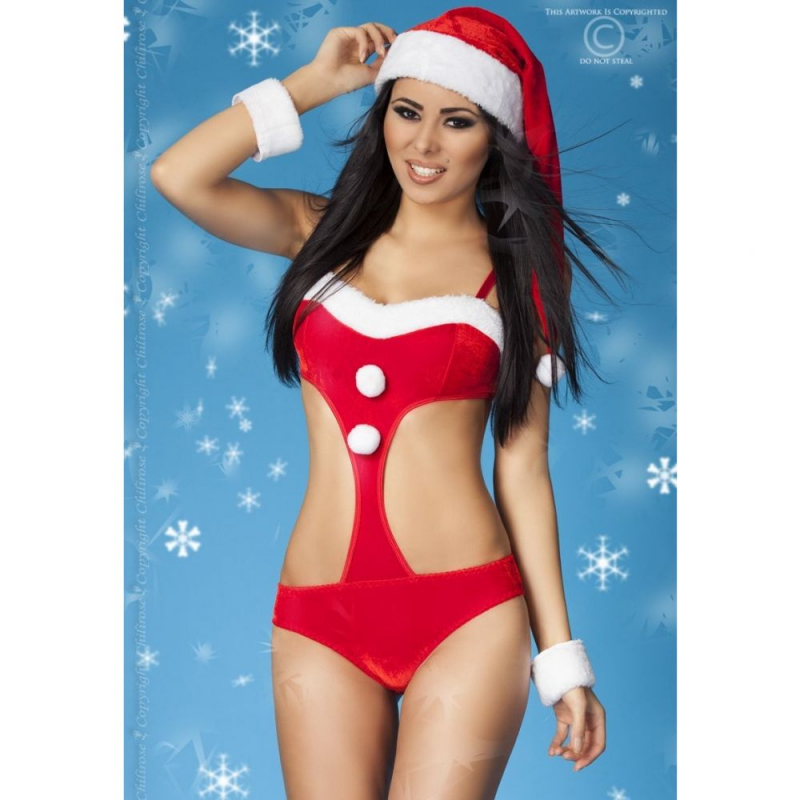 Костюм состоит из восхитительного бархатного боди в красном цвете. Вырезы по бокам и декор из белого меха придают особенную пикантность! Боди на регулируемых бретелях